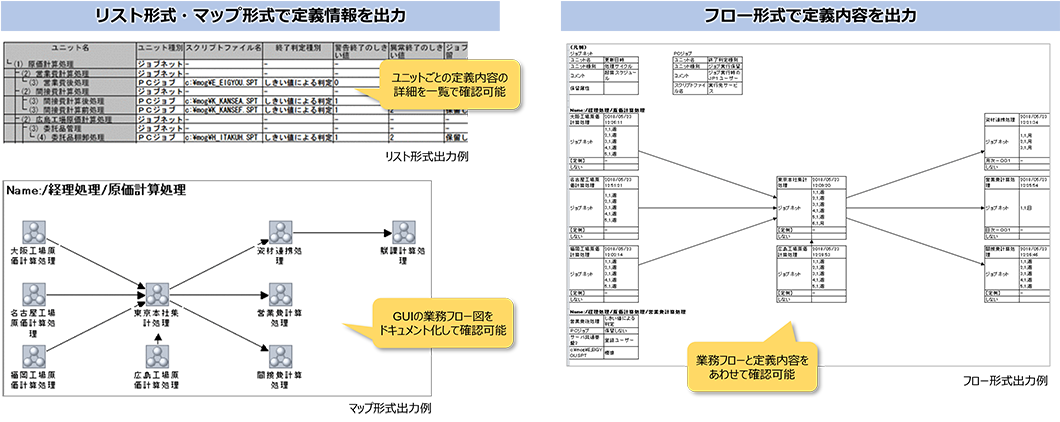 画面に表示される定義情報や予実績情報をファイルに出力して利用できます。出力する項目を選択できるため、画面に表示されるジョブネットフローの定義内容を紙面で確認したり、実行予実績の報告書を作成するなど、幅広い場面で活用できます。出力時のファイル形式も、CSV、Microsoft Excel、PDFと用途に応じて選択できます。