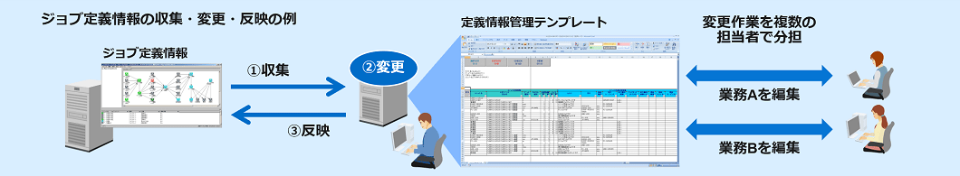 ジョブ定義情報の収集・変更・反映といったジョブ変更時の一連の作業は、Microsoft Excelの検索や一括置換などを利用することで効率よく行えます。複数の担当者が担当業務ごとに変更した内容を1つのファイルにまとめてインポートすることで、変更内容を一度に反映できます。開発サーバー用のサーバー名などの定義情報をMicrosoft Excelで本番サーバー用に変更したあと、本番環境に一括で反映するときなどにも効果を発揮します。