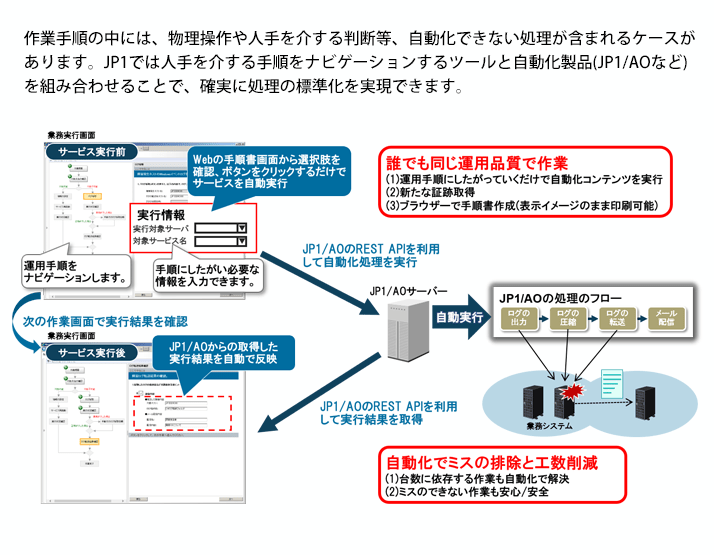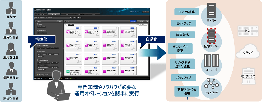 OS、仮想環境などの操作対象において、複雑な作業や時間を要する日々の運用オペレーションを標準化・自動化。専門知識やノウハウの有無に関わらず運用作業を実施できるようにすることで、効率向上と品質向上を実現します。