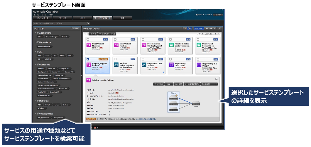 - 信頼性の高いサービステンプレートを利用することで、簡単な設定だけで標準的な運用操作を自動化できます。
