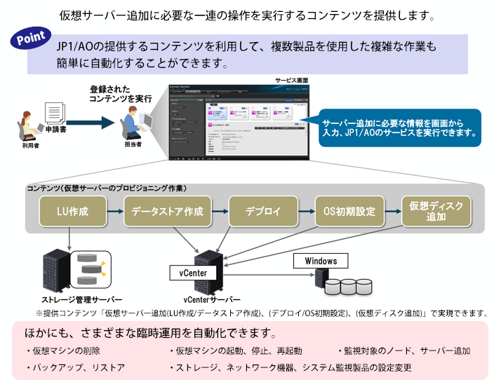 仮想マシンの作成や運用に関わる一連の作業(ソフトウェアのインストール・設定など)を自動化することで、作業のスピードアップと、仮想環境の運用負荷を軽減できます。