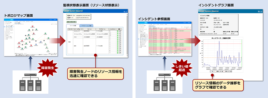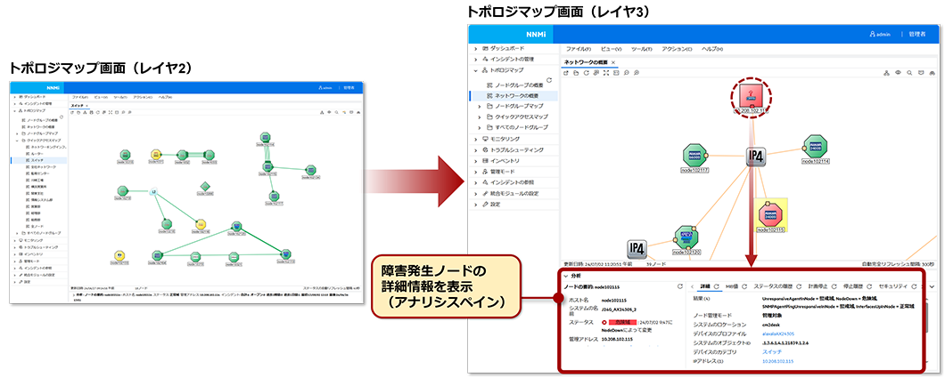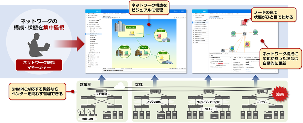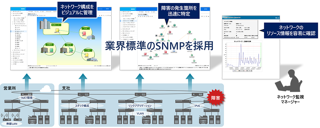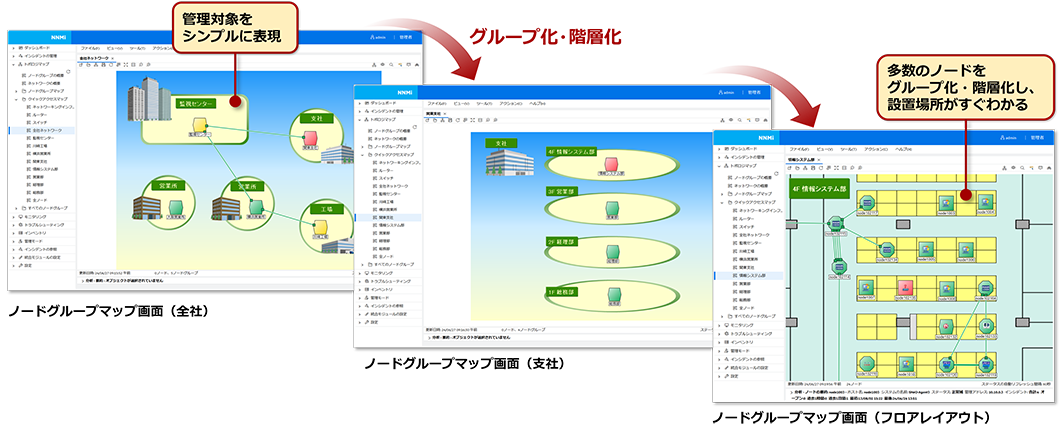 - 障害が発生しているネットワーク機器がどこに設置されていて、どこに影響があるか、速やかに特定できます。