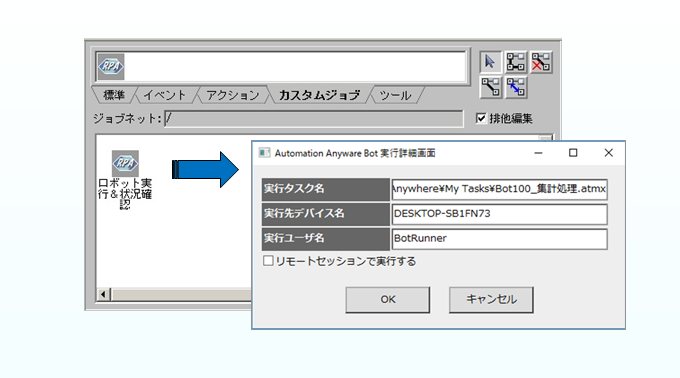 AA連携カスタムジョブは、実行タスク名(ソフトウェアロボット名)、実行先デバイス名、実行ユーザ名を定義するだけで簡単にJP1/AJS3からAAのソフトウェアロボットを実行できます。