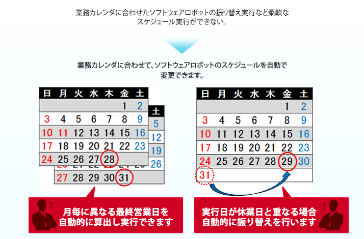 • お客さまの業務カレンダーに合わせた月末実行、休業日の自動振り替えなど柔軟なソフトウェアロボットのスケジュール実行を実現します。