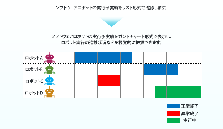 • ソフトウェアロボットの実行予実績、実行状態をスケジュール表で素早く確認ができます。