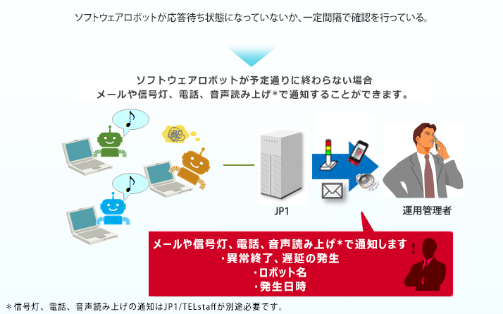 • ソフトウェアロボットの異常終了や開始・終了遅延を検知し、メールや信号灯、電話、音声読み上げでの通知を行います。
