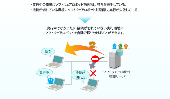 • 実行中でなかったり、接続が切れていない実行環境にソフトウェアロボットを自動で振り分けることができます。