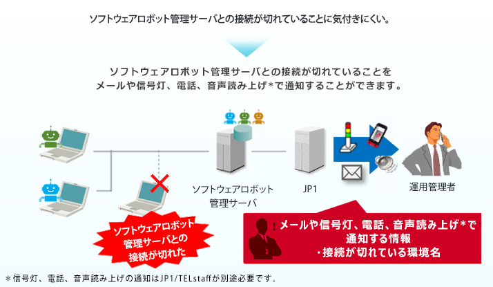 • ソフトウェアロボット管理サーバーとの接続が切れていることをメールや信号灯、電話、音声読み上げで通知することができます。