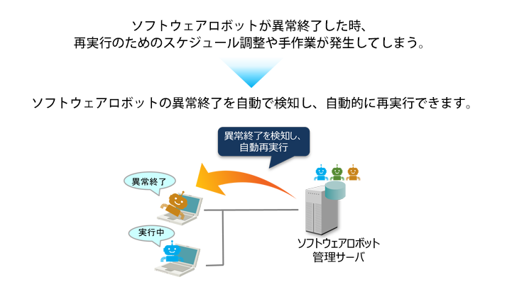 • ソフトウェアロボットが異常終了したら、自動で再実行したいが時間も手間もかかる。
