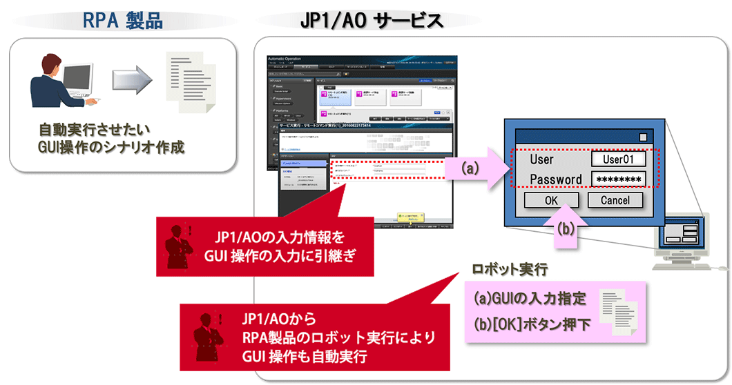 GUI操作の自動化に必要な支援を行います。 JP1/AOとGUI操作ツールを連携させたソリューションです。 |
