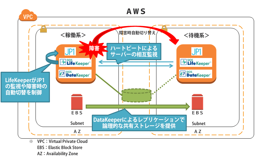 Linux環境は、物理・仮想・クラウド環境に対応*1しています。HAクラスターソフトのLifeKeeperにて障害を検知し、待機系への切り替えを行います。DataKeeperはブロックレベルでリアルタイムレプリケーションを実行することで論理的な共有ストレージとしてLifeKeeperに認識されます。障害発生時にはLifeKeeperと連動して、JP1の切り替えを実施します。