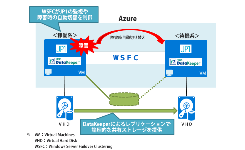 Azure上では、WindowsOS標準のHAクラスター機能であるWindows Server Failover Clustering(WSFC)機能にて障害を検知し、待機系への切り替えを行います。DataKeeperはブロックレベルでリアルタイムレプリケーションを実行することで論理的な共有ストレージとしてWSFCに認識されます。障害発生時にはWSFCと連動して、JP1の切り替えを実施します。