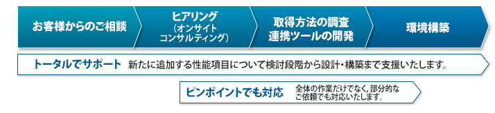 - 監視対象としたい性能項目の取得方法の調査から連携ツールの開発、環境設定までサポートします。