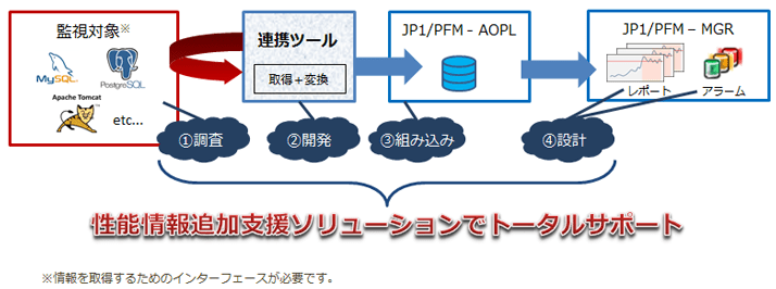 本ソリューションでは、新たな監視項目をJP1/PFMに追加する際の実現方法の検討から連携ツールの開発、データ構造の設計、環境の構築までトータルに支援します。