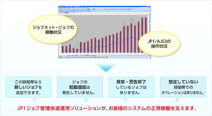| お客さまからJP1/AJS3のログファイルをいただくだけで、稼働状況を7種類のグラフ・表として「見える化」し、報告します。 | |