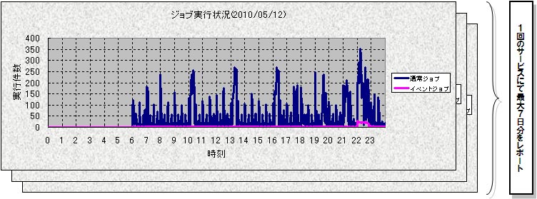 | ジョブ実行状況レポート | 稼働中のジョブ数を把握できます。 →システム停止可能な時間帯の確認やジョブ追加を計画する際に活用できます。 |