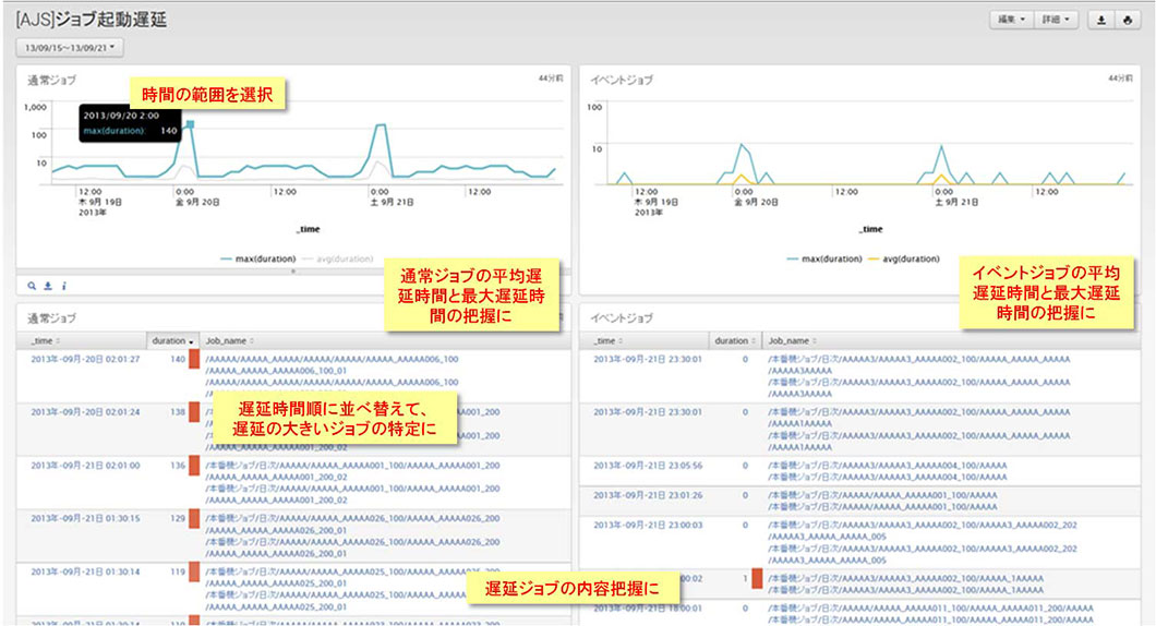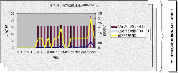 | 通常ジョブ起動遅延レポート | 通常ジョブの起動性能に影響が生じていないか把握できます。 →パラメータのチューニングなどを行う際に活用できます。 |