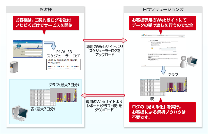 ご契約後、お客さまにてJP1/AJS3のログファイルをお客さまWebサイトにアップロードいただくだけで、サービス開始。稼働レポートの作成が完了次第、お客さまにメールにてお知らせします。