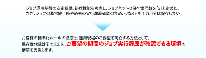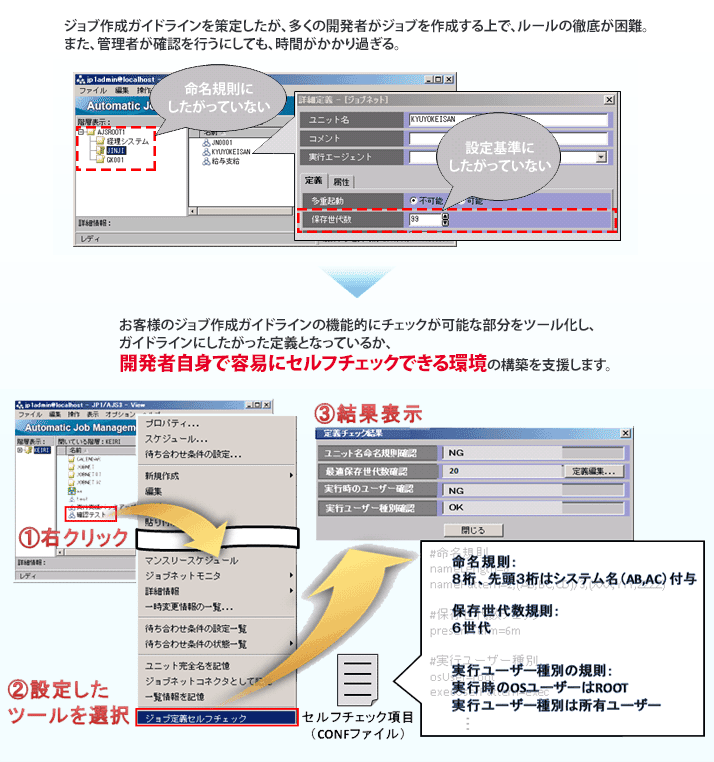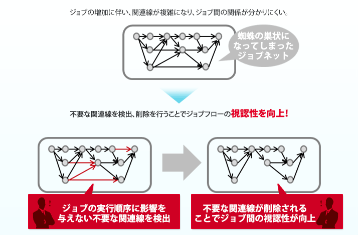| 現状のジョブネット定義を解析し、保守性向上に繋がる改善策を提供します。 | |