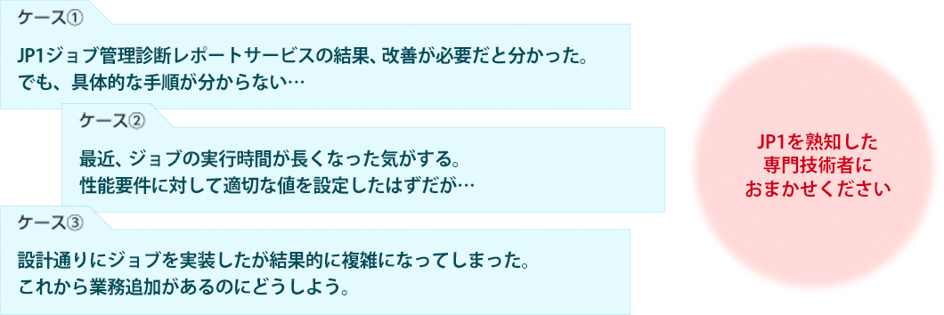 JP1専任テクニカルエンジニアが改善案を実現するための方法や実際の作業時の支援を含んだコンサルティングを行います。このサービスは本ソリューション以外でも提供しております。JP1/AJS3に関してお困りの際には、ぜひご相談ください。