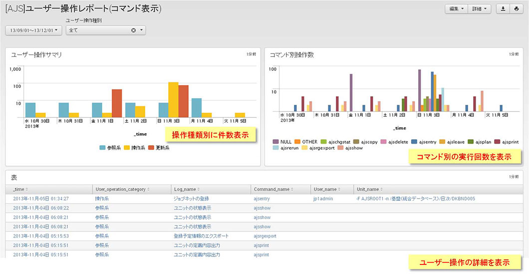 | ユーザー操作サマリレポート | 予定されていない時間帯に、ジョブ・ジョブネットの操作が発生していないかどうか、把握できます。 →不正なアクセスがないか、確認する際に活用できます。 |