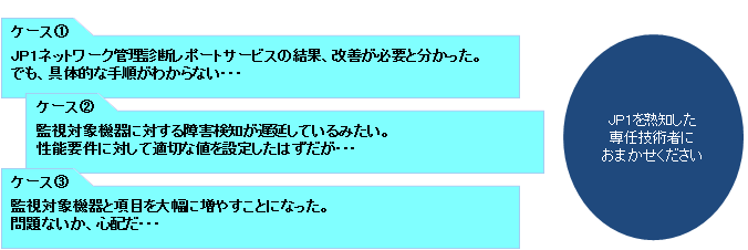 - JP1ネットワーク管理製品をご利用中のお客さまに対し、製品の稼働状況の「見える化」および「分析・診断」することにより、 監視システムの健全性、運用継続性の向上を実現します。