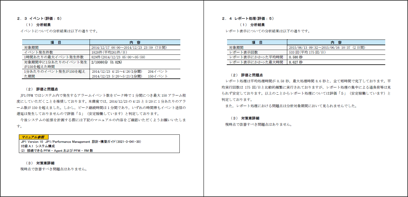 | イベント | JP1/PFMシステム内で発生したイベントの発生状況を評価し、発生頻度の高いイベントを特定して改善方法を提案します。 |
