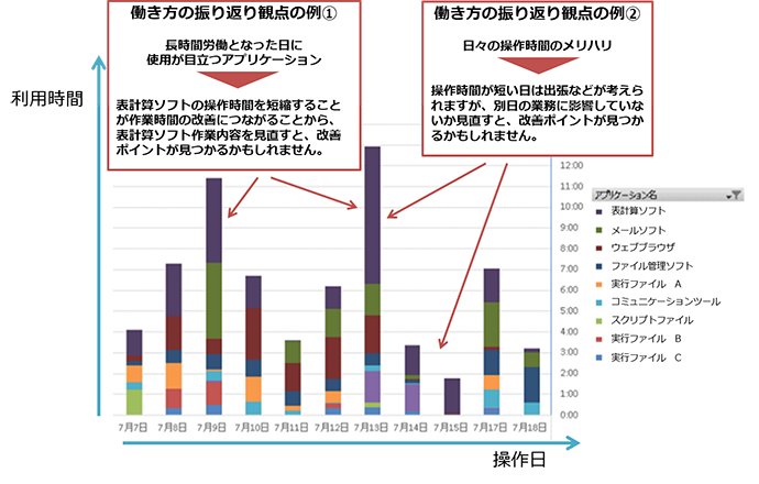 - 労働状況の把握が難しいテレワーク環境においては、社内でのPCの利用状況とテレワーク環境の利用状況を比較することで、社内とテレワーク環境での実施業務の相違を見える化、労働実態の把握を可能にし、テレワーク環境の活用を促進できます。