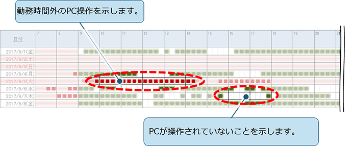 PC操作ログを用いて、社外のテレワークも含めた個人や組織の労働状況を見える化します。