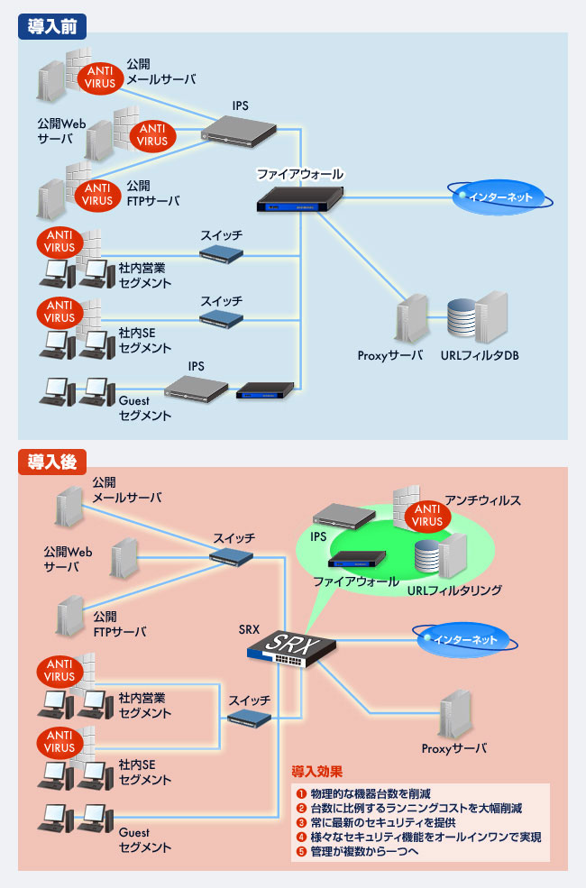 SRX1台で、あらゆるセキュリティの脅威に対応。機器の管理も1台で行えるようになります。