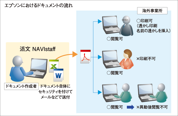 第一の強固なセキュリティ環境の実現においては、暗号化したファイルであれば公開・配布後もアクセス権限と操作権限を動的にコントロールでき、万一流出が生じた場合でも閲覧不可にできるなどのドキュメント統制機能が格段に優れていました。また復号化の長期的な安定性とグローバル利用の適正の点でも、他社製品にはないメリットがあったことも大きなポイントになりました。エプソンでは、暗号化した機密文書を5年後、10年後に閲覧する可能性を考慮し、暗号化後のデータが製品独自の特殊なフォーマットではなく、パソコンの機種やOS環境に依存しないPDFファイルに変換される「活文 NAVIstaff」のメリットを高く評価したのです。PDFであればAdobe Readerのみで閲覧できることから、社内約3万台のパソコンに新たなソフトウェアを購入・インストールする必要がありません。国内外のパートナー企業にも新たな負担をかけることがない上、エプソンにとっても暗号化プログラムの輸出手続きの負担がない。これも大きなメリットとして受け止められました。