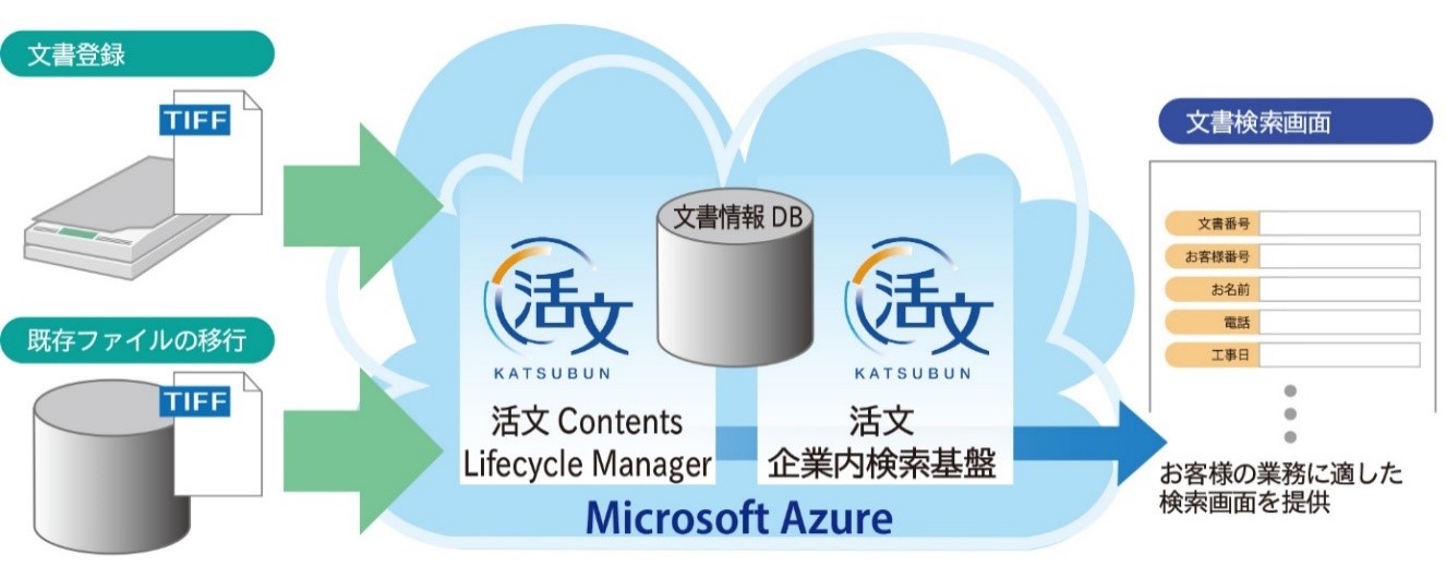 このRFPに応えて、日立ソリューションズを含む数社がシステム提案を提出。各社の提案内容を精査したJ:COMは、「活文 Contents Lifecycle Manager」「活文 企業内検索基盤」と「 Microsoft Azure(以下、Azure )」を組み合わせた日立ソリューションズの提案を、新しい文書管理基盤として採用することに決めました。