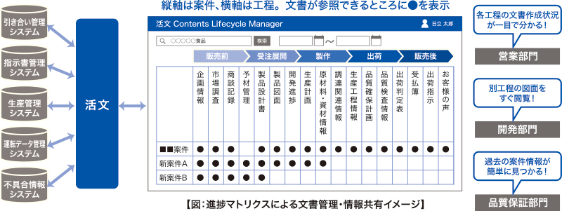 ディーゼルエンジンなどのパワートレインを製造・販売するヤンマーパワーテクノロジーは、複数の工程や部門にまたがる文書閲覧と情報共有をめざして、日立ソリューションズの「活文」を導入。進捗マトリクス画面を追加開発することによって、各工程の文書を一覧で確認できる部門横断型の文書管理を実現しました。今後、グループ共通のデータ連携まで拡大する見通しです。