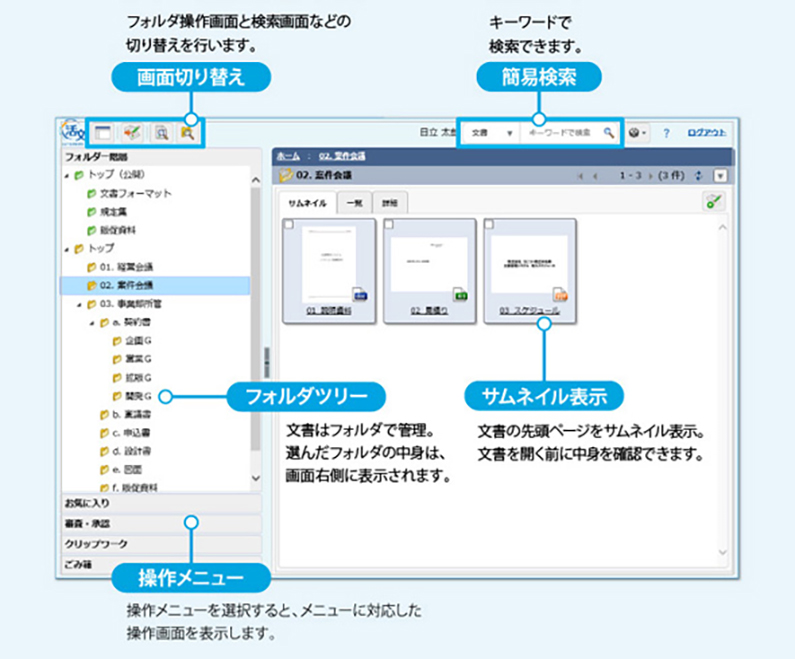「活文」のメイン画面。文書ファイルの登録や移動は、ドラッグ&ドロップ操作をするだけと簡単。Webベース(Internet ExplorerもしくはGoogle Chrome)でどこからでも利用できる。ファイルは文書の1ページ目がサムネイルとして表示される