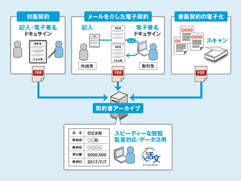 契約プロセスの可視化やセキュアな保管などは、近年企業に求められている課題の1つだが、「活文」はこうしたニーズにも対応しており、インターネットを通じて署名や承認処理が行える「Docusign」と組み合わせた電子契約ソリューションを用意している。