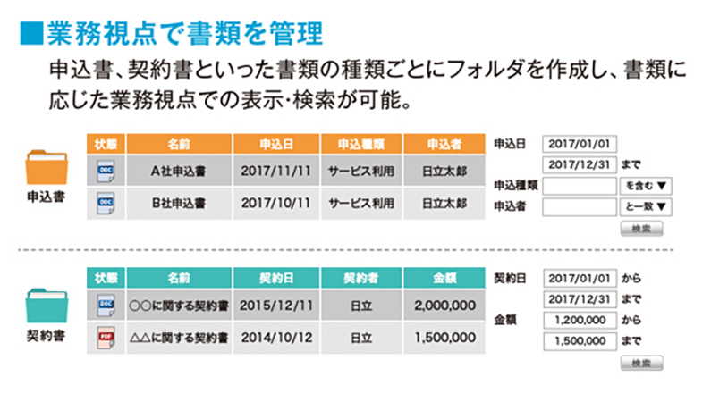 申込書や契約書といった文書の種類でフォルダを分け、申込者や担当者、サービス内容、契約期限などの詳細項目を設定することで、業務の効率化だけでなく、情報資産を戦略的に活用できるようになる