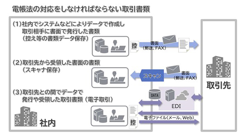電帳法の対応をしなければならない取引書類には「(1)社内でシステムなどによりデータで作成し取引相手に書面で発行した書類(控え等のデータ保存)」と「(2)取引先から受領した書面の書類(スキャナ保存)」「(3)取引先との間でデータで発行や受領した取引書類(電子取引)」に大別される。