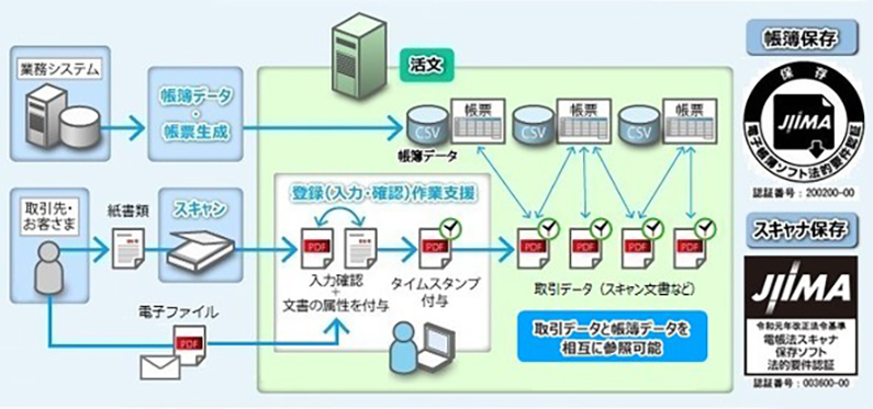 活文による「国税関係帳簿書類」「スキャナ保存」「電子取引情報」の一元管理(日立ソリューションズ提供/※JIIMA認証ロゴは公益社団法人 日本文書情報マネジメント協会によりライセンスされています)