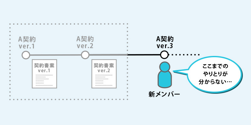契約業務のスタートは契約書案の作成です。契約業務担当者は事業部とやりとりを重ね、ビジネスプランが反映されるように契約書案を作っていきます。そして当社の場合、案がある程度固まるとリーガルチェックのために法務担当者がチームに加わります。このように契約業務ではプロセスが進むと関係者が増えることがありますが、その度に説明資料を作ったりして、これまでの経緯を改めて共有することになっていませんか?この作業、実は「隠れボトルネック」かもしれません。