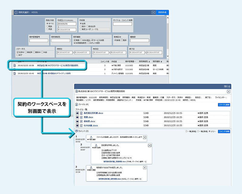 既存契約の条件変更に向けた準備。新しい担当者ではどう頑張っても情報の抜け漏れのリスクからは逃れられませんし、そもそも文書を探したり、経緯を辿る手間は本業とは言い難く、効率化したいものです。