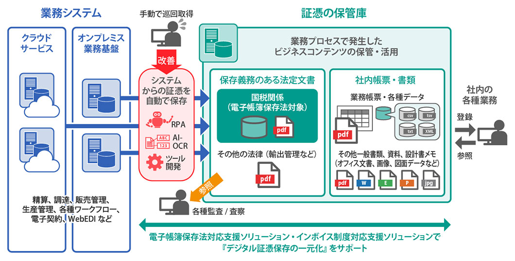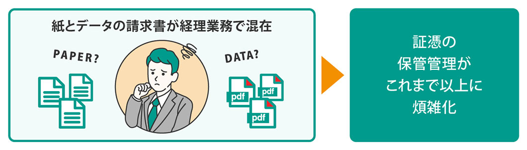 もはや電子化・デジタル化の潮流を止めることはできません。「義務化への対応」「必要最低限の対応」以外には目をつぶってきた企業も、検討に着手できていなかった企業も、ここから先は自社の状況や取引先とのやりとりを踏まえつつ周辺の電子化・デジタル化対応にも目を向け、長期的な視点で真のDX実現につながる取り組みを戦略的に推進していく必要があります。たとえば、メールで受領した請求書の電子保存を実現したとしても、「紙で受領した請求書は紙のまま保存」「自社で発行する請求書は従来どおり紙で出力」「請求書以外の見積書や契約書、納品書などの書類は紙で処理」といったように、社内には依然として紙ベースでのやり取りが残っています。これでは、「かえって電子保存の手間が増えただけ」と言えなくもありません。さらに、紙は紙、データはデータで管理し続けていると、業務の効率化が進まないだけでなく、情報の検索性が低下し、新たな価値を生み出すようなデータ活用は難しくなります。