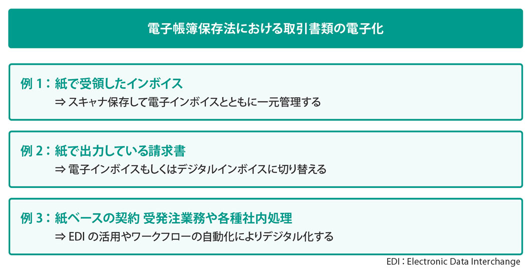では、電子帳簿保存法における電子取引情報の電子保存を最優先として、「義務化への対応」「必要最低限の対応」の次のステップとして取り組むべきことを具体例で考えてみましょう。次に挙げた3つは、社内に残る紙ベースでのやり取りを電子化・デジタル化するための方法論です。法律上任意とされているこれらの対応については、優先順位にしたがって段階的に着手していくことになります。
