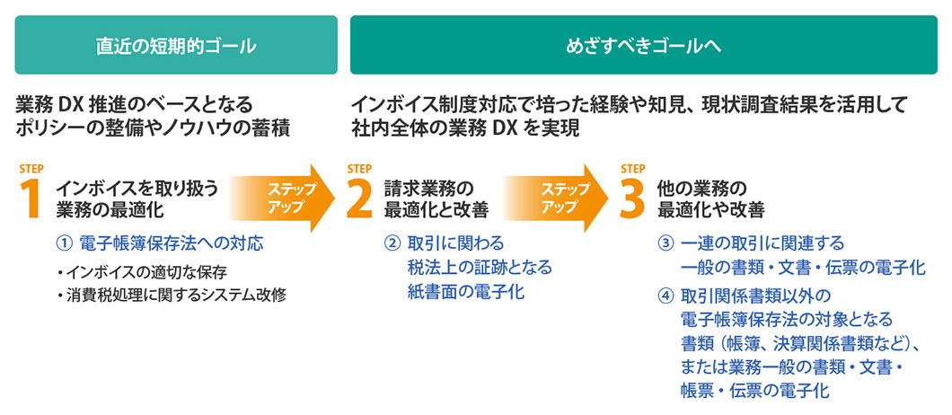 特に請求書業務に関わるインボイス制度対応においては、調達や受発注に関する複数のシステムから情報を抽出するといったプロセスが手作業で実施されている場合も多く、法制度への対応とあわせて全社的な業務フローの見直しが必要になるでしょう。したがって、インボイス制度対応を起点として業務DXを推進する場合、まずは自社のめざすべきゴールの方向性を定め、直近の短期的ゴールを達成するために構築した環境をベースに、社内全体での業務の最適化や改善を段階的に進めていくことになります。