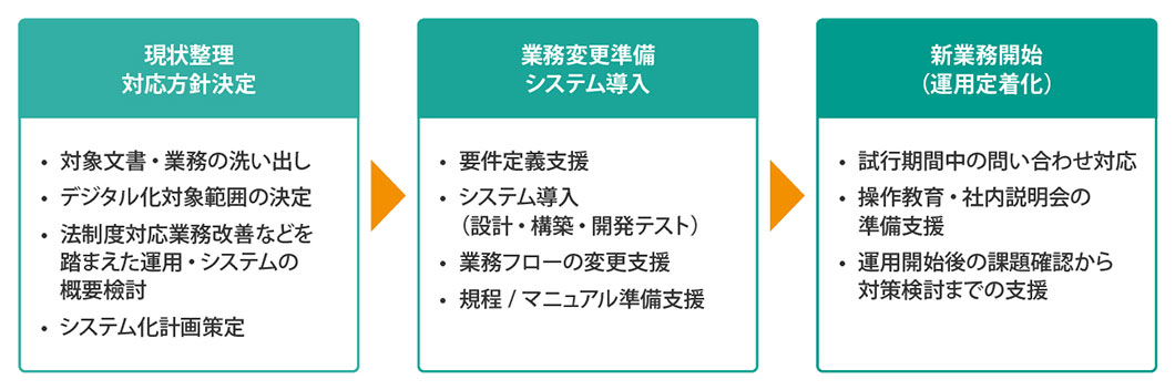 これらのノウハウを生かし、To-BeとAs-Isの明確化から、そのギャップを埋めるために必要な取り組みの洗い出し、システムや業務フローの変更、実運用まで、企業のインボイス制度や電子帳簿保存法の対応をワンストップで支援。お客さまの状況に合わせた真の業務DXの実現に向け伴走します。