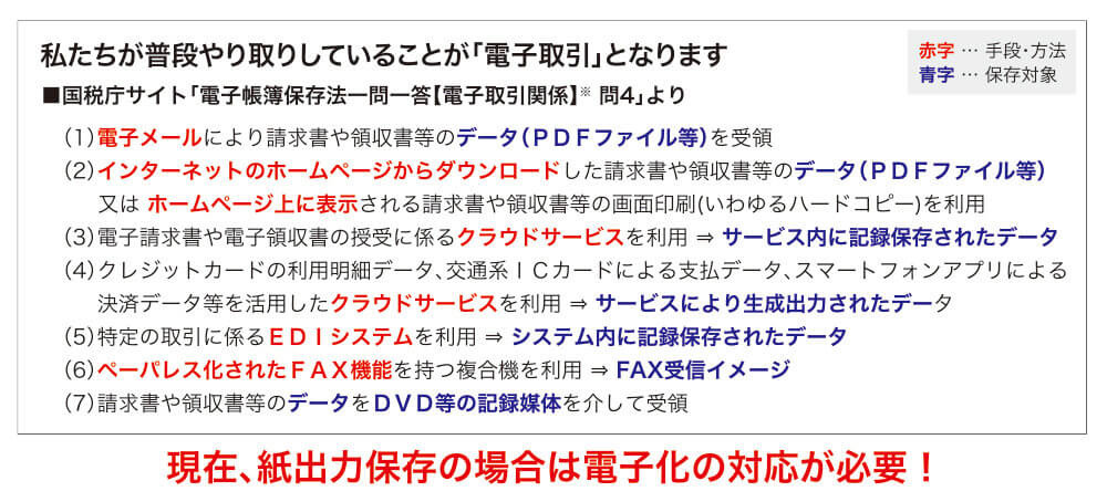 私たちが普段使用している、電子メールやEDI(Electronic Data Interchange)サービス、ペーパーレス化されたFAXといったさまざまな手段での情報の授受が電子取引であり、取引の過程でやりとりするすべての文書が「電子取引情報」になります。