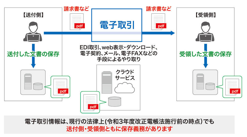 ちなみに以前は、送付側と受領側ともに電子取引情報が企業内のシステムに保存されている必要がありました。しかし令和2年度の改正で、電子契約サービスなどのクラウドサービスを介して文書を授受しており、このサービスが電帳法の要件を満たしている場合は、送付側と受領側ともにクラウドサービスにデータを保存することが認められました。