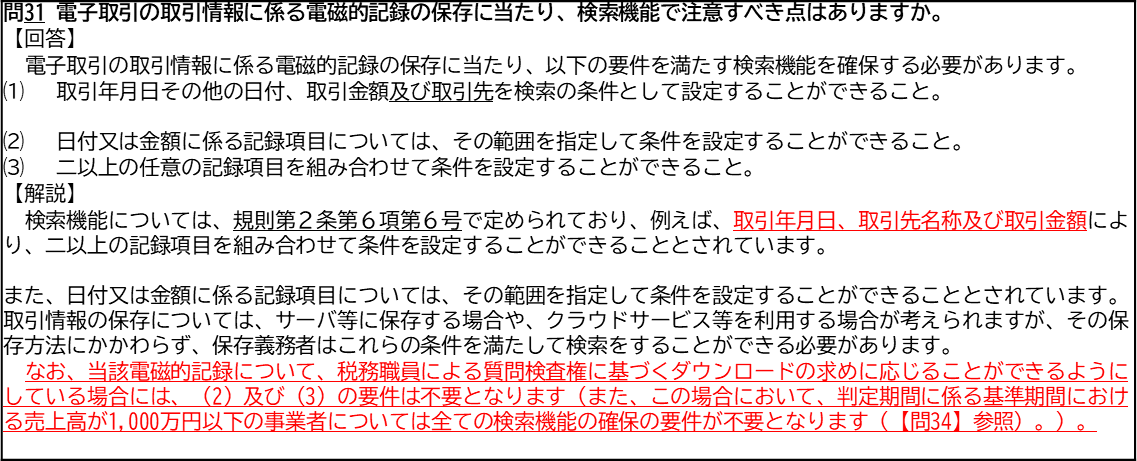 一問一答の問31におけるシステム要件の解説(図3)を見ると、「税務職員による質問検査権に基づくダウンロードの求めに応じることができるようにしている場合には」、範囲検索や組み合わせ検索といった検索機能が不要になると解釈できます。しかし、この一文については注意が必要です。