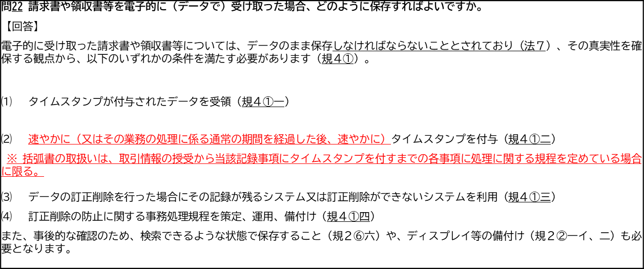 一問一答の問22(図4)の回答を見ると(2)の受領後のタイムスタンプ付与について、改正前の「受領後遅滞なくタイムスタンプを付与」から「速やかにタイムスタンプを付与」と要件が少し緩和されています。