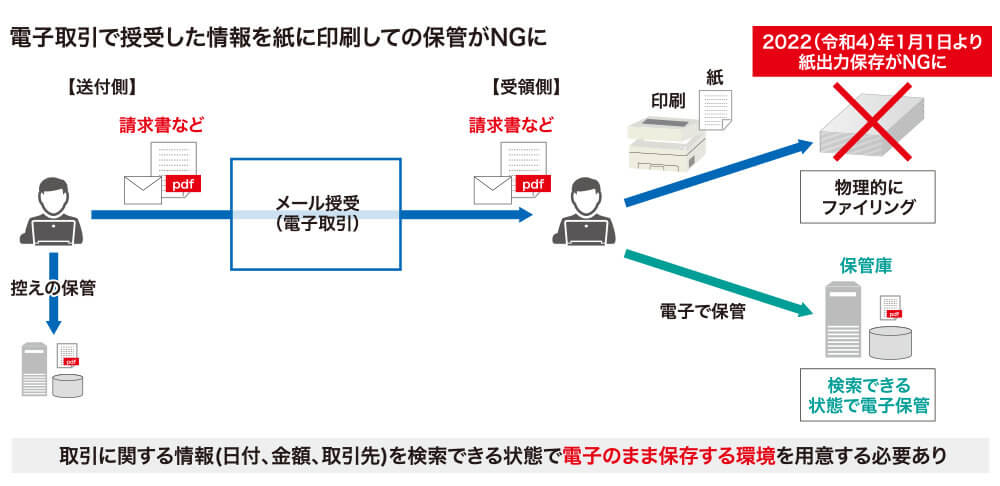 改正後は取引に関する情報(日付、金額、取引先)を検索できる状態で電子のまま保存する環境を用意する必要があります。今まで電子取引情報を紙で保管していた場合には大きな影響がありますので、該当する企業は早急な対応を検討されていると思います。