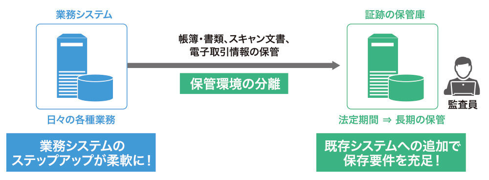 電子取引情報をはじめとする電子帳簿保存法に関連する証跡は、各業務システムに分散して保管するのではなく、独立した保管庫にまとめることをお勧めします。これにより証跡を業務システムで長期保管する必要がなくなり、システムのバージョンアップやリプレースを柔軟に実施できます。